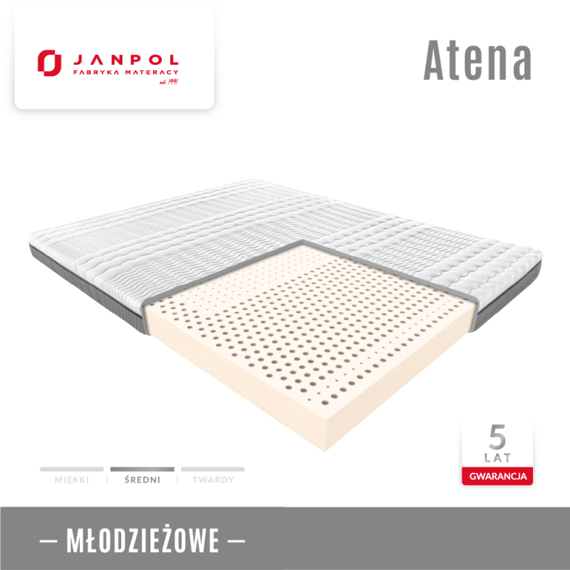Doskonała propozycja dla starszych dzieci i młodzieży. Życie dziecka polega na odkrywaniu świata. Każdego dnia zdobywa wiedzę i nowe doświadczenia, a to wszystko wymaga sporej dawki energii. Materac Atena będzie doskonałym startem i metą każdej dziecięcej przygody. Wnętrze materaca tworzy bardzo gęsty i elastyczny lateks. Doskonale dopasuje się do ciała i życia zarówno energicznego kilkulatka, jak i niezależnego nastolatka.