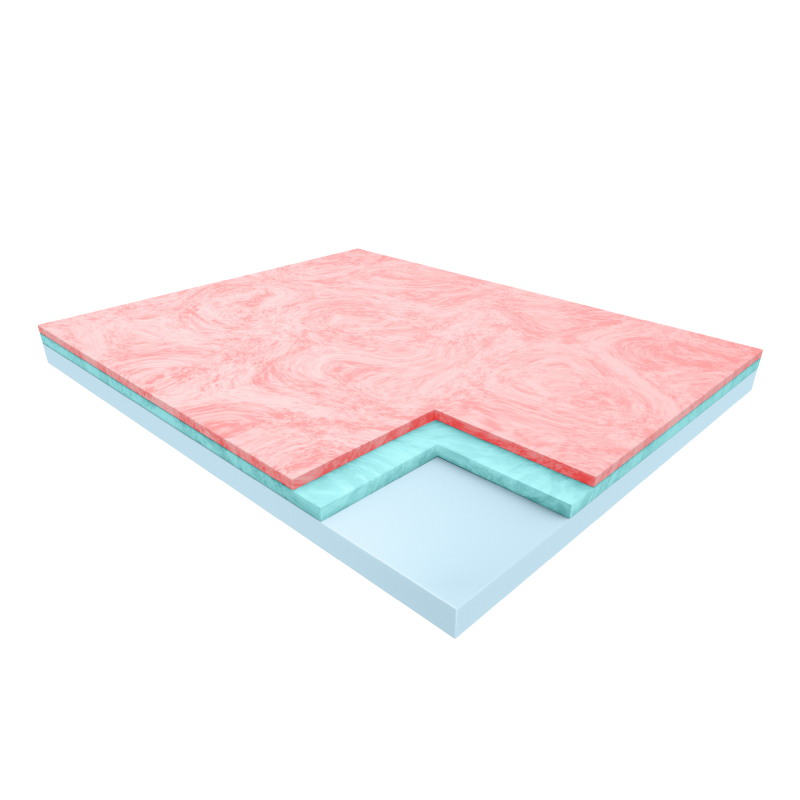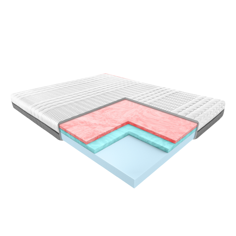 Pianka EnergyFoam (35 kg/m³) – stanowi wytrzymałą i sztywną bazę materaca. Dzięki precyzyjnemu zbalansowaniu twardości i elastyczności zapewnia solidne podparcie dla kręgosłupa, zapobiega zapadaniu się powierzchni nawet przy większym obciążeniu, a jednocześnie dopasowuje się do naturalnych krzywizn ciała. Otwarta struktura komórkowa gwarantuje doskonałą wentylację oraz skuteczne odprowadzanie wilgoci i nadmiaru ciepła. Pianka Red Soft (3 cm) – pianka żelowa nowej generacji o zwiększonej gęstości, odpowiadająca za stabilność i twardsze podparcie. Wspiera ciało w zachowaniu prawidłowej pozycji, zapobiegając nadmiernemu zapadaniu się materaca. Doskonale współgra z bardziej miękkimi warstwami, tworząc zrównoważony układ. Pianka Blue Soft (4 cm) – miękka i sprężysta pianka żelowa, która delikatnie otula ciało, minimalizując punkty nacisku. Jej otwarto-komórkowa struktura umożliwia swobodny przepływ powietrza, co przekłada się na komfortowy, świeży i higieniczny sen.