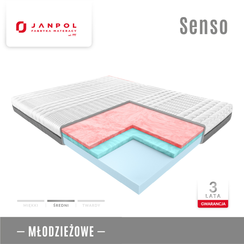 Materac Senso został zaprojektowany z myślą o dorastającej młodzieży, której ciało potrzebuje odpowiedniego wsparcia w okresie intensywnego wzrostu. Pomaga zregenerować się po dniu pełnym nauki, zajęć i treningów, oferując zrównoważone połączenie stabilności, elastyczności i komfortu. Jego wielowarstwowa konstrukcja oparta jest na nowoczesnych piankach o komplementarnych właściwościach.